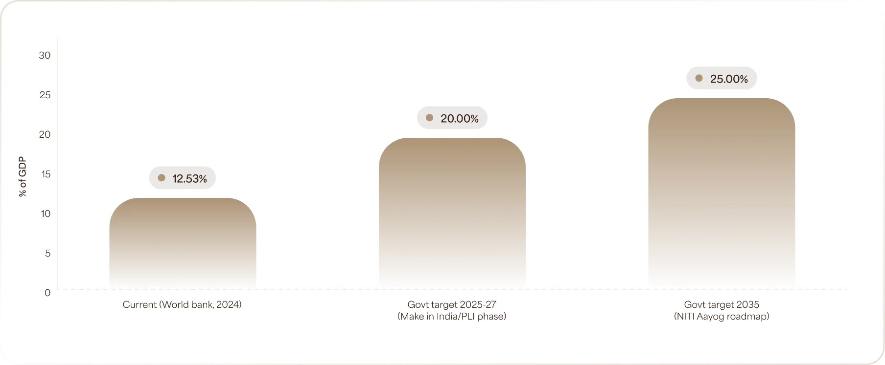 India Manufacturing Share: Current Level vs Government Targets (with Timelines)