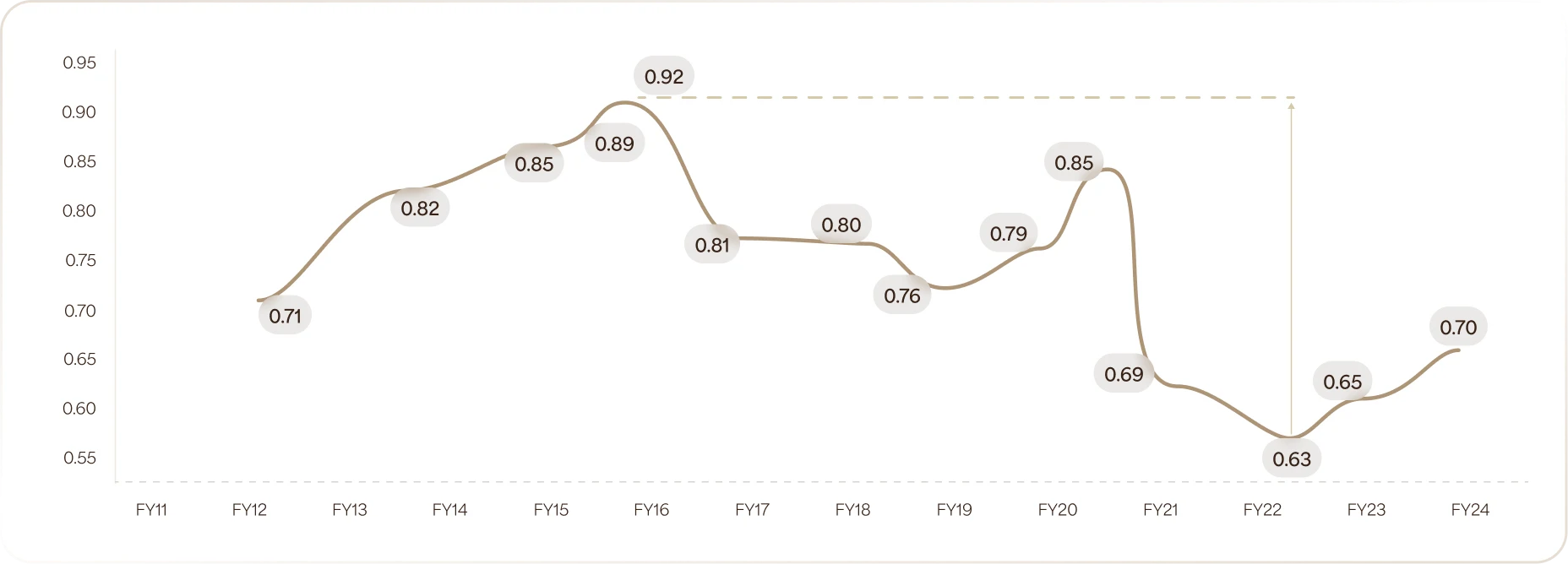 India Manufacturing Sector - Debt to Equity ratio trend (2005-24) Aggregate, RBI-based